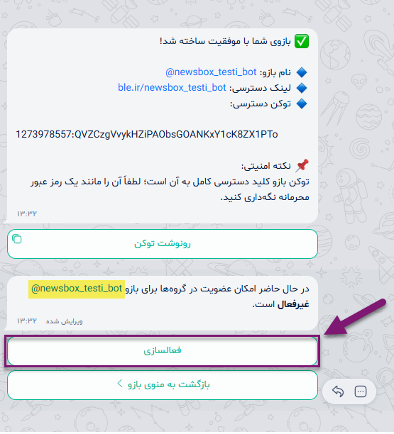 5. در بخش جدید گزینه “گزینه فعالسازی” را انتخاب کنید. با این کار بات مورد نظر برای عضویت در کانال شما فعال میشود.