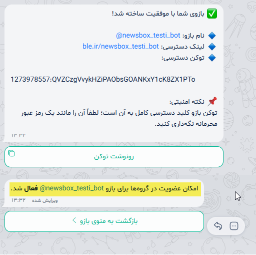 4. پس از دریافت توکن، منوی بات به شما نمایش داده میشود.