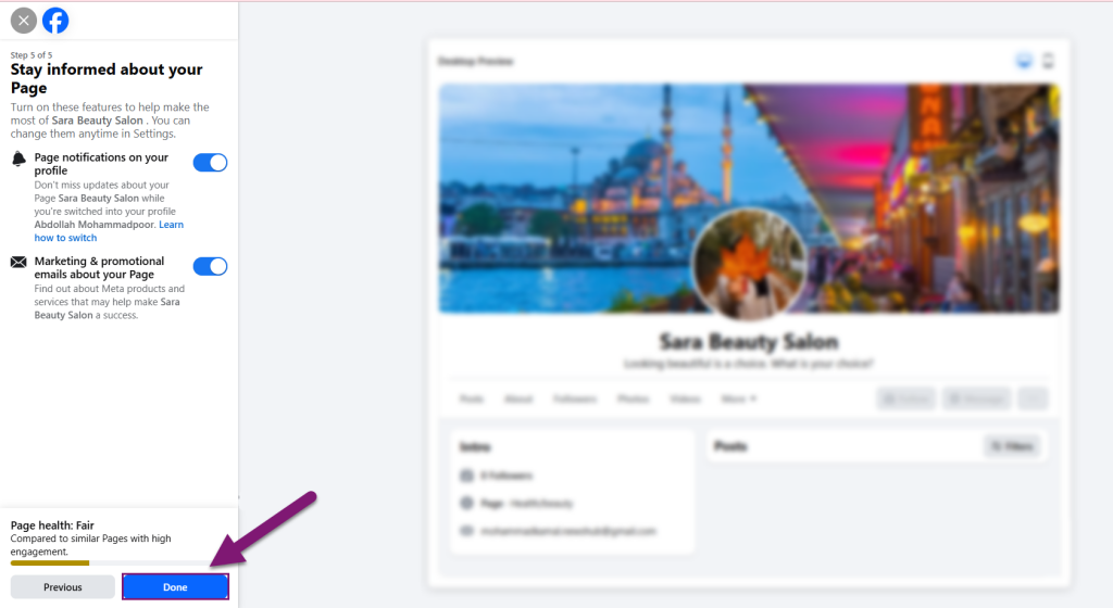 با دکمه done مراحل ساخت پیج فیسبوک را به پایان رسانید.