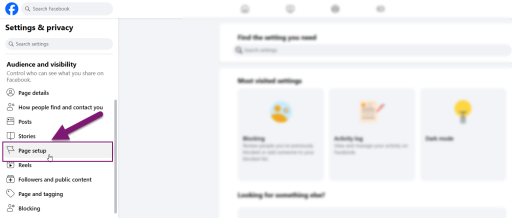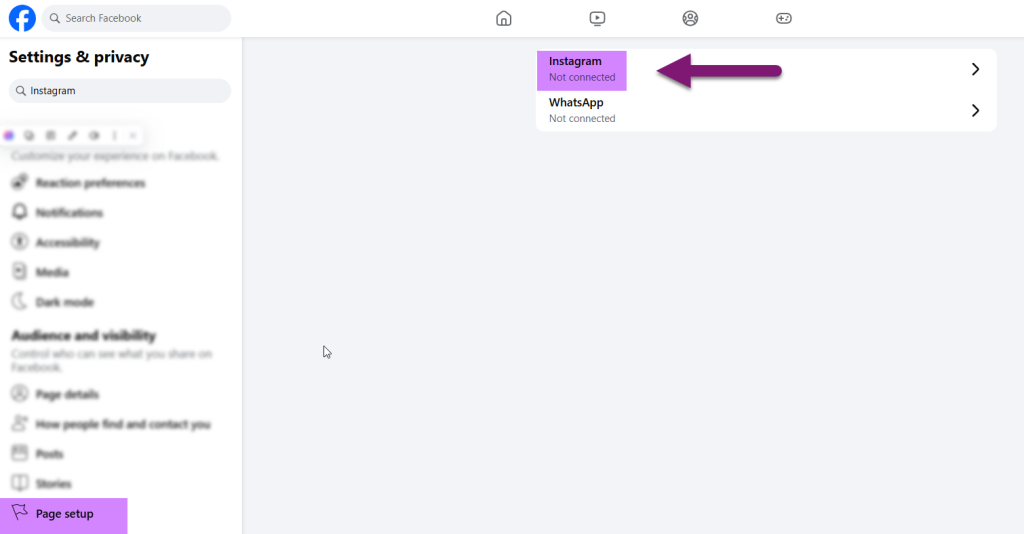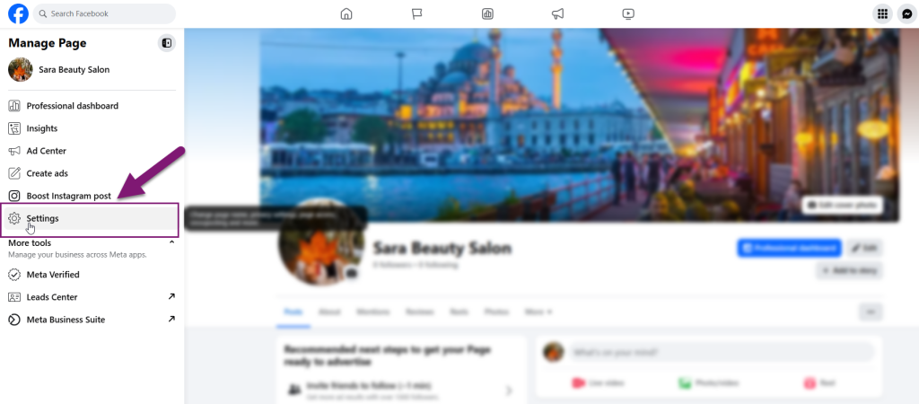11. پس از ساخت پیج فیسبوک، از قسمت settings وارد بخش تنظیمات پیج شوید تا در ادامه کار، اتصال اکانت اینستاگرام (بیزینسی) را به فیسبوک انجام دهید.