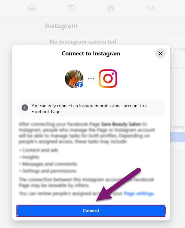 15.در پنجره جدید به شما اجازه میدهد که پیج اینستاگرام بیزینسی (professional) خود را به پیج فیسبوک خود متصل کنید.