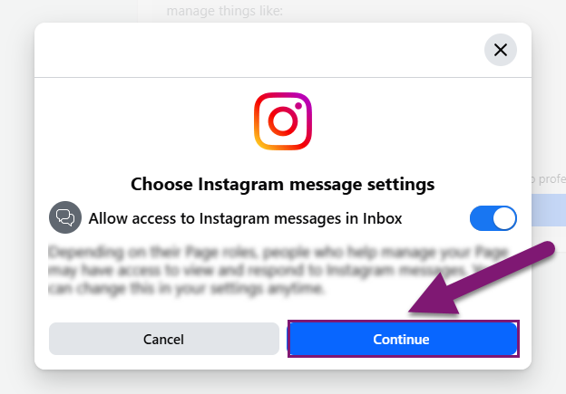 16. در پنجره بعدی اجازه میدهید اکانت فیسبوکتان به مسیجهای اکانت اینستاگرام دسترسی داشته باشد.