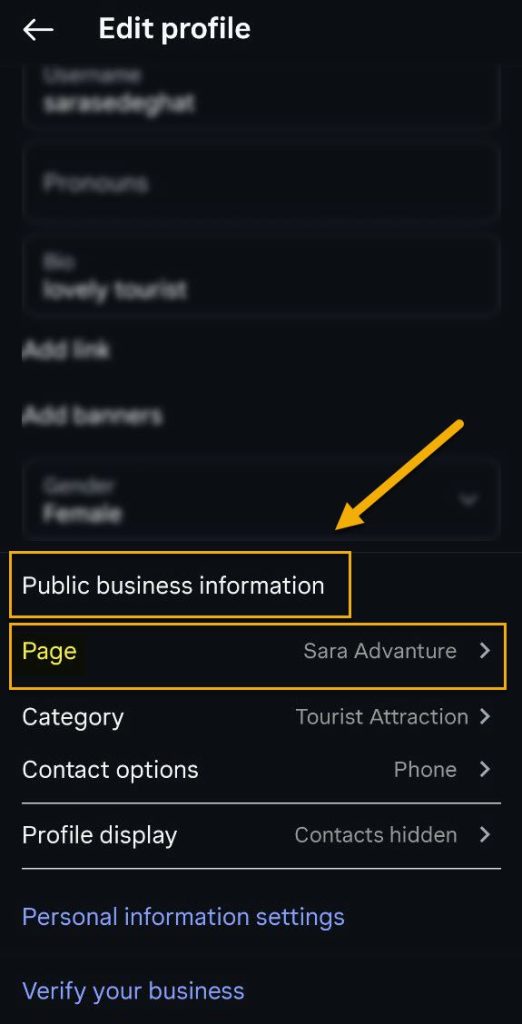 3. در پایین قسمت Public Business/Profile Information، گزینه page را انتخاب کنید.