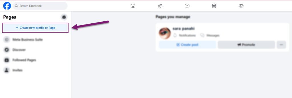 2. از پیج فیسبوک، گزینه Create new profile or pageرا انتخاب کنید.