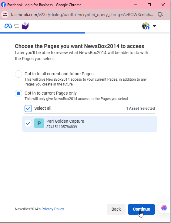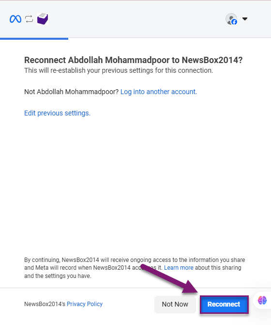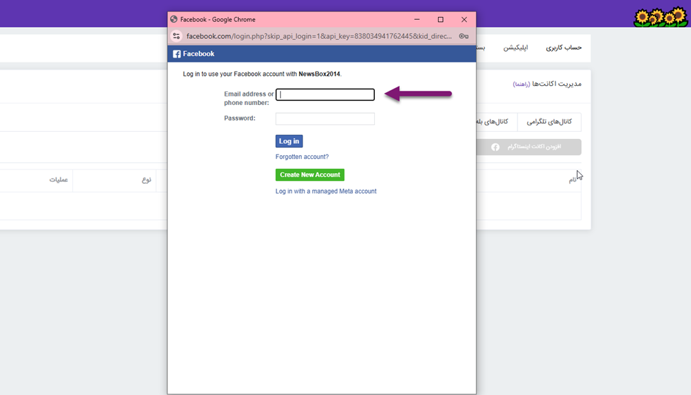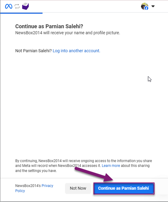 به خاطر داشته باشید، اگر پیش از “اتصال اکانت اینستاگرام” در نیوزباکس، از قبل در مرورگر خود، در اکانت فیسبوکتان لاگین کرده باشید به صورت اتوماتیک و با صرف مراحل کمتری، فرآیند اتصال اکانت انجام میشود.