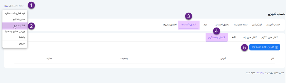 4. در بخش “اتصال اکانت” تب” اتصال اینستاگرام” را انتخاب کنید.